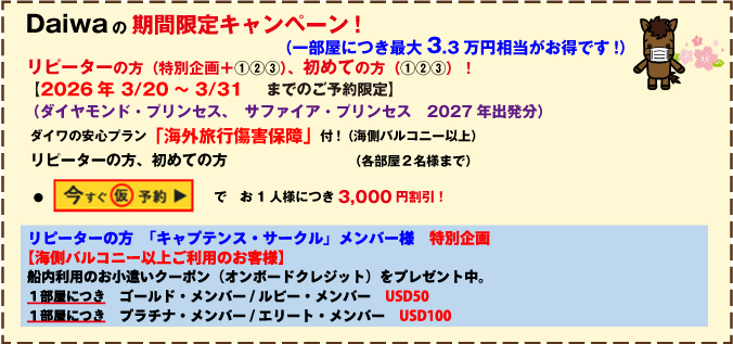 平素より、ダイワグループをご用命頂き、ありがとうございます。指定代理店として取扱のプレミアム外国船ダイヤモンド・プリンセスは、2019年度の