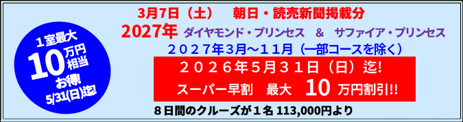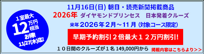 2026年プレミアムクラス客船 115,875トン ダイヤモンド・プリンセス・日本発着クルーズ(英国船籍)