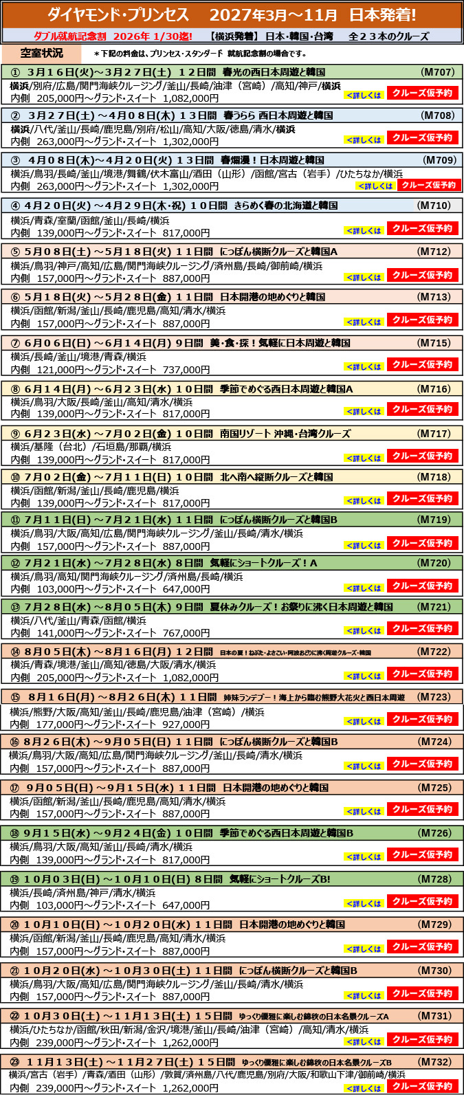 2025年3月〜8月出発(全25出発日) ダイヤモンド・プリンセス 日本発着クルーズ |