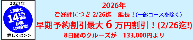 | クイーン・エリザベス | 飛鳥U | コスタセレーナ | シルバー・ミューズ | ディズニー・クルーズ(カリブ海) | クァンタム・オブ・ザ・シーズ | |||||