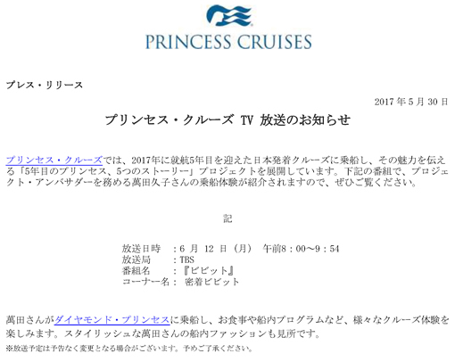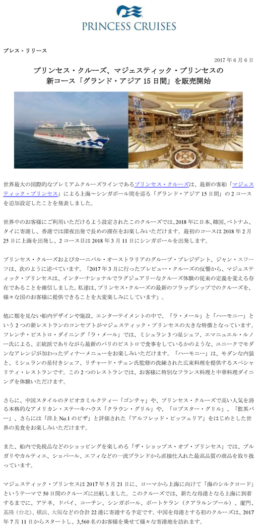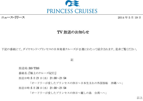 プリンセス・クルーズの詳細については、日本語ページ(http://www.princesscruises.jp/)、または各旅行会社までお問合せください。
